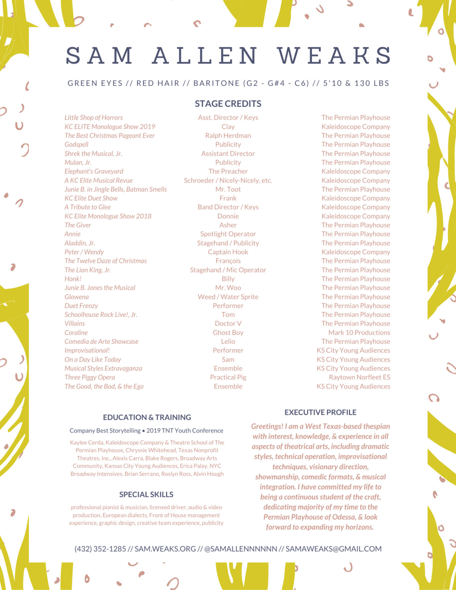 Since childhood, it's been deemed just about impossible to keep Sam off of a stage. Growing up attending camps & intensives from Kansas City Young Audiences & the Theatre School at the Permian Playhouse, Sam is now a member of the Kaleidoscope Company ELITE troupe & has fully submerged himself in the art of theatre. Spending majority of his spare time at the Permian Playhouse & taking professionally led training whenever possible, he has honed in on his interest, knowledge, & experience in all aspects of theatrical arts, including dramatic styles, technical operation, improvisational techniques, visionary direction, showmanship, comedic formats, & musical integration. He has done acting & technical work on over thirty shows at only age seventeen, including Junie B. Jones, Annie, The Giver, The Lion King, Schoolhouse Rock Live!, Aladdin, & Elephant's Graveyard, for which the show won the Texas Nonprofit Theatres award for Outstanding Storytelling.He made his musical directorial debut managing the band of the Kaleidoscope Company’s A Tribute to Glee and has since assistant-directed on Shrek the Musical and Little Shop of Horrors. He is also a longtime competitor in Odyssey of the Mind and competed as a World Finalist in the 40th Annual World Finals Tournament. As well as previous training with New York workshops and local intensives, he began studies this year with Broadway Arts Community under Broadway alumni Chryssie Whitehead & Alexis Carra. Sam hopes to always continue embracing & expanding his theatrical horizons.